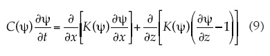donde ψ es el potencial de presión del agua en el suelo, expresado como la altura de una columna equivalente de agua [L] (positivo en la zona saturada y negativo en la zona no saturada del suelo); C(ψ) = dθ/dψ es denominada la capacidad específica de humedad del suelo; θ = θ(ψ) es el volumen de agua por unidad de volumen de suelo o contenido volumétrico de agua [L3L-3], y es una función de y conocida como curva característica de humedad o curva de retención del agua; K = K(ψ) es la conductividad hidráulica [LT-1], que en un suelo parcialmente saturado es una función del potencial de presión; el potencial gravitacional es asimilado a la coordenada espacial z, orientada positivamente hacia abajo [L]; ∇ = (∂/∂x,∂/∂y,∂/∂z) es el operador gradiente; x, y son las otras dos coordenadas espaciales [L] ,y t es el tiempo [T].