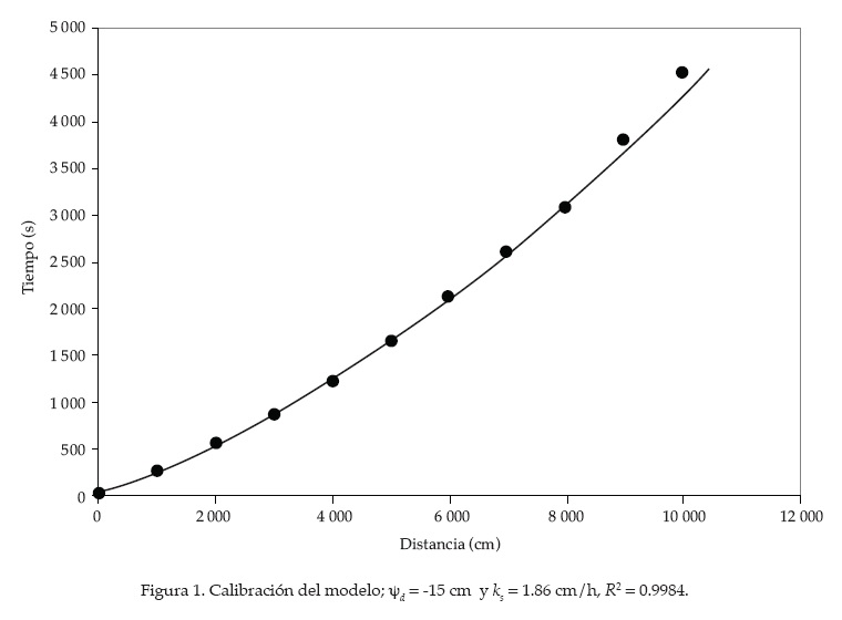 La caracterización hidrodinámica de la arcilla de La Chontalpa ha sido efectuada por Saucedo et al. (2003). Se tienen los valores siguientes para la característica de humedad de van Genuchten (1980): contenido volumétrico de agua residual θr = 0.0 cm3/cm3; contenido volumétrico de agua a saturación θs = 0.5245 cm3/cm3; parámetro de forma m = 0.066. Para la ecuación de Brooks y Corey se tiene el parámetro η = 21.19. Los dos parámetros restantes {Ψd,Ks} se estiman a fin de reproducir la curva de avance observada de modo experimental en una prueba de riego. Se ha utilizado un valor β = 2 del parámetro asociado con la extracción de momentum debida a la infiltración. El cálculo del número de Reynolds permite clasificar el régimen de flujo laminar, por lo cual se utiliza d = 1 como parámetro de la ley de resistencia.