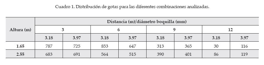 En campo se recolectaron 4 100 fotografías de las cuales se seleccionaron 1 450 que muestran gotas dentro del plano de análisis. Un total de 7 285 gotas se incluyen en la caracterización del aspersor. En el cuadro 1 se presenta su distribución de acuerdo con altura del aspersor, diámetro de boquilla y distancia desde el aspersor. La figura 4 ilustra fotografías con cuatro de las gotas que conforman el conjunto analizado; la información corresponde a distancia desde el aspersor donde se tomó la imagen (D) así como diámetro (d), longitud (Lg), ángulo de caída (θ) y velocidad (V) de la gota.