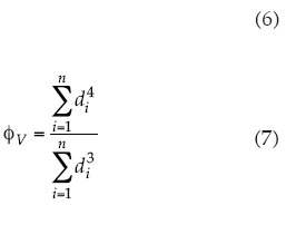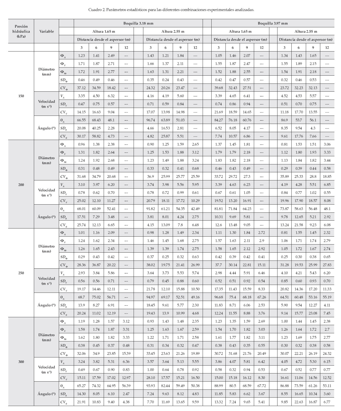 Las gotas incluidas en la caracterización fueron tratadas estadísticamente. Los parámetros calculados para el diámetro, la velocidad y el ángulo de caída fueron diversos: media aritmética (ΦA, mm; VA, m s-1; θA, °); desviación estándar (SDΦ, mm; SDV, m s-1; SDθ, °) y coeficiente de variación (CVΦ, %; CVV, %; CVθ, %). Además, en el caso específico del diámetro, también se determinaron la media al 50% del volumen acumulado (Φ50, mm) y la media volumétrica (ΦV, mm). El cálculo de la media aritmética, desviación estándar, coeficiente de variación, media al 50% y media volumétrica, se realizó con las ecuaciones (3)-(6), respectivamente: