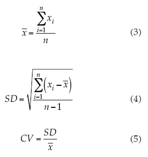 Donde x representa diámetro, velocidad o ángulo de caída; di es el diámetro de cada gota en el conjunto; n, el número de gotas en el conjunto; i, un número ordinal desde 1 hasta n.
