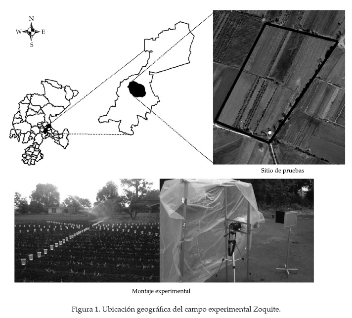 Los ensayos se realizaron dentro de un campo experimental ubicado en la comunidad de Zoquite, Guadalupe, Zacatecas (México), a unos 15 km de la capital del estado. Localizado entre las coordenadas geográficas 22º 48' 34" de latitud norte, 102º 26' 57" de longitud oeste y a una altura media sobre el nivel del mar de 2 100 m (figura 1). El lugar cuenta con una estación climatológica Vantage Pro2 de la casa comercial Davis Instruments; con ella se monitorea temperatura, radiación solar, humedad relativa y precipitación, así como dirección y velocidad del viento. La propiedad cuenta con un sistema de riego por aspersión en cobertura total, equipado con una bomba centrífuga horizontal de tres pulgadas en succión y descarga con un motor Siemens de 10 HP. El tipo de aspersor utilizado es de la casa comercial Waderain, Estados Unidos, 2007, modelo WR-33, con inclinación de 27° respecto a la horizontal y con dos boquillas; la principal de 3.97 mm y la secundaria de 3.18 mm sin vaina prolongadora del chorro. Las presiones hidráulicas evaluadas fueron 150, 200, 250 y 300 kPa, y las características de las gotas se midieron en puntos de observación separados 3, 6, 9 y 12 m desde el aspersor. Se eligieron alturas de 1.65 y 2. 55 m entre la superficie del suelo y el centro del aspersor para llevar a cabo los experimentos.