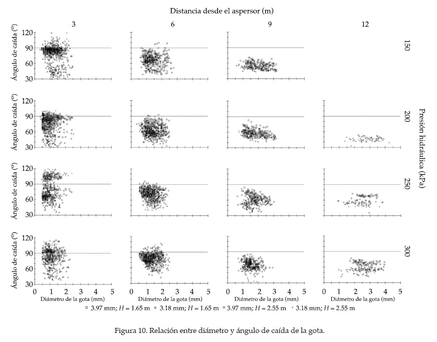 La figura 10 muestra el ángulo de caída para las distintas gotas analizadas en las 64 combinaciones. En general se observa que esta variable disminuye su valor a razón de 0.07 grados m-1 (respecto a la horizontal) conforme aumenta la distancia alcanzada por las gotas desde el aspersor. Esta circunstancia se atribuye al hecho de que a mayores distancias, las gotas son de mayor diámetro y viajan también a mayor velocidad. También disminuye el ángulo conforme aumenta la presión hidráulica, con una tasa de 0.032 grados kPa-1. Hablar de una tendencia clara con la variación en la presión hidráulica resulta complicado. El rango de valores en el ángulo de caída resultó ser muy grande, sobre todo para las menores distancias de observación, lo anterior se refleja con claridad tanto en la desviación estándar como en el coeficiente de variación.