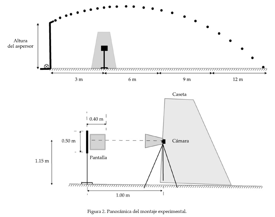 Con base en lo anterior, el objetivo de este trabajo se centra en la caracterización geométrica y cinemática de las gotas emitidas por un aspersor de impacto en ausencia de viento, aplicando la metodología de Salvador et al. (2009), para producir un conjunto de datos con valores de diámetro, velocidad y ángulo de incidencia a diferentes combinaciones de presión hidráulica, altura del aspersor, diámetro de boquilla y distancia alcanzada por las gotas para su posterior aprovechamiento en mejoras al modelo balístico.