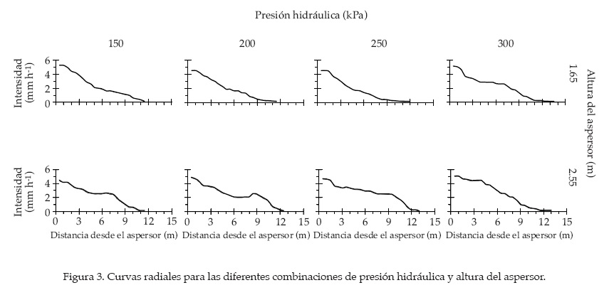 En la figura 3 se muestran las curvas radiales para 150, 200, 250 y 300 kPa de presión hidráulica, y a las alturas de 1.65 y 2.55 m. Describen un patrón triangular de mojado, tal como lo refieren Kincaid (1982), Tarjuelo (1995) y Montero (1999), lo anterior debido a que la pluviometría se determinó para las dos boquillas descargando al mismo tiempo. La distancia que moja el aspersor aumenta con el incremento de la presión a razón de 0.01 m kPa-1, mismo valor encontrado por Bautista et al. (2009) para un aspersor modelo VYR35 fabricado por VYRSA. En todos los casos, la tasa de precipitación máxima se obtuvo a una distancia de 0.50 m. Las intensidades registradas por los pluviómetros fueron 5.32 mm h-1 y 4.43 mm h-1 para 150 kPa; 4.56 mm h-1 y 4.87 mm h-1 para 200 kPa; 4.56 mm h-1 y 4.68 mm h-1 para 250 kPa; 5.20 mm h-1 y 5.06 mm h-1 para 300 kPa, para el aspersor operando a las alturas de 1.65 m y 2.55 m, respectivamente. Kincaid (1982), Kincaid (1991) y Bautista et al. (2009), trabajando en condiciones de laboratorio y utilizando una sola boquilla, reportan valores muy similares a los indicados antes; las diferencias oscilan alrededor del 5.4%. Por otra parte, Salvador et al. (2009) obtuvieron intensidades alrededor de 2.35 mm h-1 para 200 kPa, bajo condiciones experimentales de campo. Al comparar los resultados, se observan diferencias cercanas al 100%, que pueden atribuirse al hecho de que estos autores emplearon una sola boquilla.