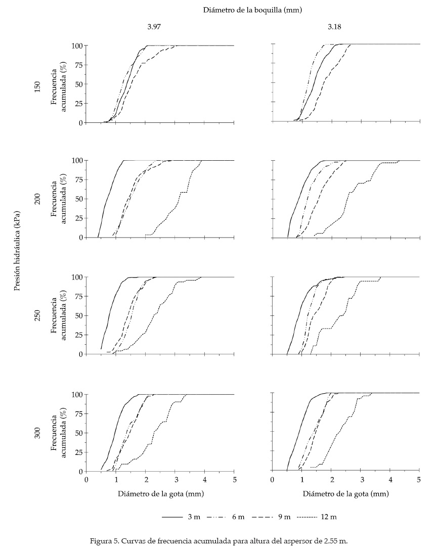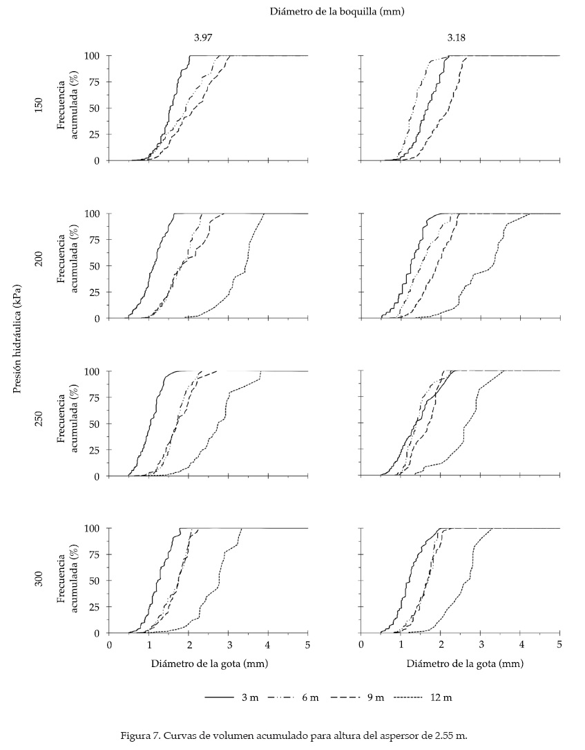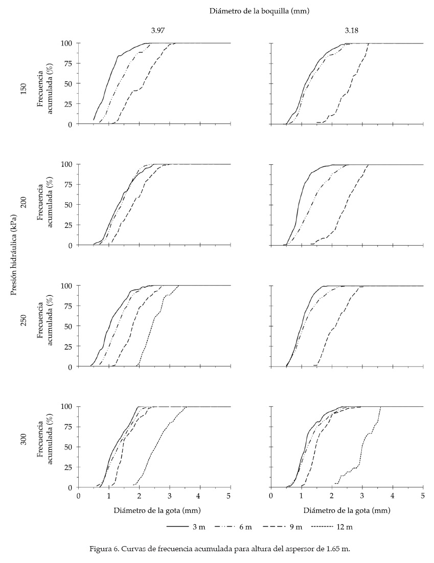 Las distintas combinaciones estudiadas (presión hidráulica, distancia de observación, altura del aspersor, diámetro de boquilla), al someterse al tratamiento estadístico con el apoyo de las ecuaciones (3)-(7) exhiben los resultados que se incluyen en el cuadro 2. El análisis muestra discrepancias entre diámetros de gotas; la tendencia indica que los menores se obtienen al calcular la media aritmética, seguida del 50% del volumen acumulado, y el mayor le corresponde al diámetro volumétrico. La comparación arroja diferencias porcentuales de 17.9 y 18.3% cuando ésta se hace de Φ50 y ΦV con respecto a ΦA; además, se observa que ΦV es 0.6% más grande que Φ50. En conjunto, los resultados muestran que para un mismo valor de presión hidráulica, el diámetro aumenta conforme las gotas caen a mayor distancia del aspersor; la tasa de incremento, considerando los valores medios de los diámetros volumétricos, es a razón de 0.19 (SD 0.02 mm m-1) y 0.15 mm m-1 (SD 0.03 mm m-1) para la boquilla de 3.18 mm, operando a 1.65 y 2.55 m de altura, respectivamente; con la boquilla de 3.97 mm y para las mismas alturas, los valores fueron 0.13 (SD 0.01 mm m-1) y 0.18 mm m-1 (SD 0.04 mm m-1). Por otro lado, en la mayoría de los casos, el diámetro de las gotas disminuye con el incremento de la presión hidráulica para un mismo punto de observación. Este efecto resulta ser mucho más evidente cuando se analizan las gotas que caen a mayor distancia del aspersor. Sin embargo, resulta complicado establecer una tendencia clara en relación con la evolución del diámetro, puesto que se presentaron casos donde al pasar de una presión menor a una mayor, el diámetro medio se incrementó. Resultados similares han sido presentados por autores como Hills y Gu (1989), o Bautista et al. (2009). Al analizar los resultados alrededor de un mismo valor de la presión hidráulica, se establece que el diámetro de la gota se incrementa a medida que la distancia desde el aspersor aumenta. En los diámetros volumétricos, la conjunción de las cuatro presiones analizadas arroja los siguientes valores medios: a) para boquilla de 3.18 mm; diámetros de gota (mm) 1.46, 1.76, 2.39, 3.31 y 1.41, 1.50, 1.84, 2.82 a distancias desde el aspersor de 3, 6, 9, 12 m, y alturas de 1.65 y 2.55 m, respectivamente; b) para boquilla de 3.97 mm, diámetros de gota (mm) 1.61, 1.71, 2.07, 2.97 y 1.25, 1.76, 1.89, 2.94 a distancias desde el aspersor de 3, 6, 9, 12 m, y alturas de 1.65 y 2.55 m, respectivamente. La comparación de los resultados anteriores con los mostrados por otros autores bajo condiciones experimentales similares indica que, en general, los obtenidos en este trabajo son mayores. Esta circunstancia se atribuye al hecho de que en los casos aquí estudiados, el aspersor trabajaba con dos boquillas operando al mismo tiempo, mientras que trabajos como los de Salvador et al. (2009), Li y Kawuano (1998), y Kincaid et al. (1996), se realizaron para un aspersor con una sola boquilla. Esta diferencia se puede traducir en pérdidas de energía y por tanto en gotas más gruesas; sin embargo, corroborar esta hipótesis implica mayor trabajo experimental. Para el conjunto de gotas capturadas, se determinaron los valores de frecuencia acumulada (figuras 5 y 6) y volumen acumulado (figuras 7 y 8) para todas las combinaciones experimentales analizadas. El análisis muestra que a presiones bajas, las gotas viajan distancias más cortas; incluso para el caso particular de la 150 kPa, las gotas no alcanzan a caer a 12 m de distancia desde el aspersor. También existe un efecto de la altura del aspersor sobre la distancia alcanzada por las gotas, puesto que a menor altura de éste, la distancia alcanzada por las gotas también es más corta. Así, a 200 kPa de presión hidráulica se presentan gotas cuando la altura es de 2.55 m; sin embargo para la altura de 1.65 m a esa presión hay ausencia de gotas.