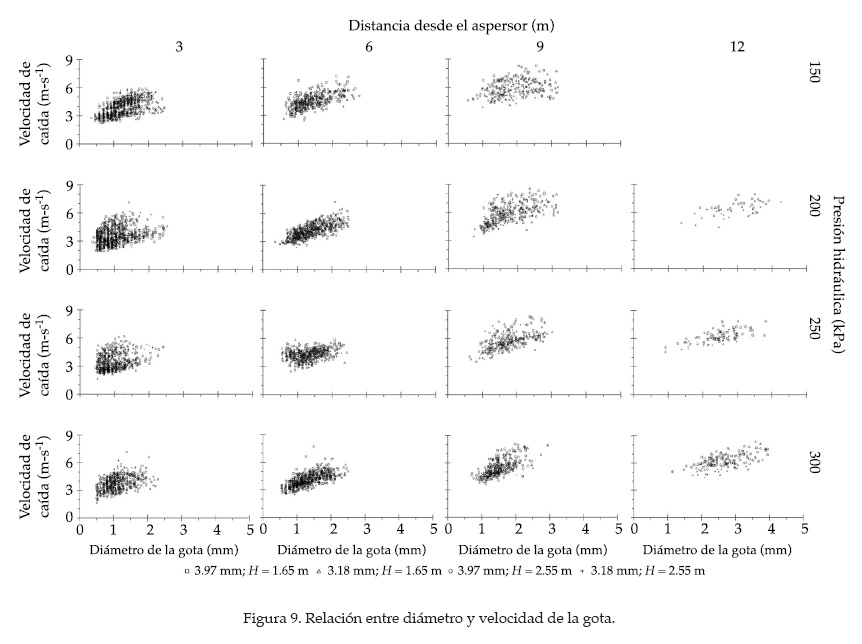 La figura 9 muestra la relación entre la velocidad alcanzada por las gotas y el diámetro de las mismas para las 64 combinaciones analizadas. En general se observa que la velocidad se incrementa conforme aumenta el diámetro de la gota; también sufre un incremento conforme aumenta la distancia alcanzada por las mismas. Lo anterior se refleja en los valores medios mostrados en el cuadro 2; en estos mismos valores se alcanza a ver que para una misma distancia se presenta una ligera disminución en la velocidad conforme se incrementa la presión hidráulica. El aumento de la velocidad con respecto a la distancia desde el aspersor ocurre a una tasa media de 0.34 m s-1 m-1; la disminución de la velocidad conforme se incrementa el valor de la presión hidráulica se refleja en una tasa media de 0.0033 m s-1 kPa-1.