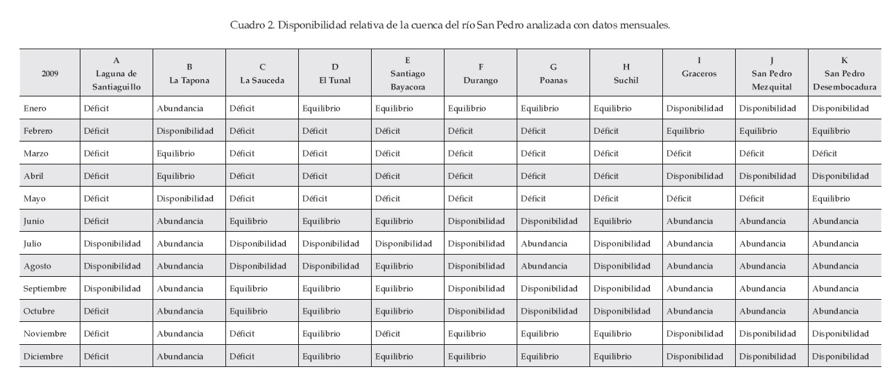 A partir de los datos hasta 2009 de precipitación, escurrimiento y usos del agua en la cuenca del río San Pedro, y aplicando la metodología descrita, se obtienen los resultados que se aprecian en el cuadro 2.