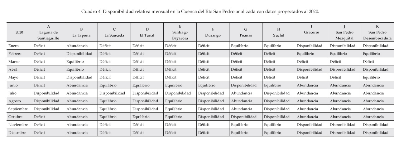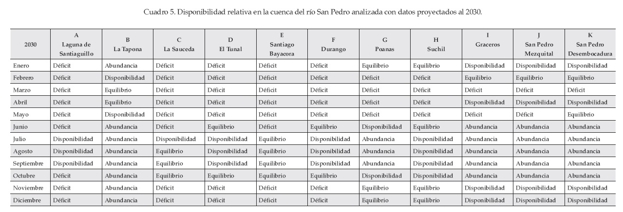 Es casi la totalidad de las subcuencas, en los meses de febrero a mayo existen condiciones de déficit, el cual se reduce al presentarse la temporada de lluvias y reaparece a partir de octubre una vez finalizada; sin embargo, lo realmente notorio es que la condición de la disponibilidad relativa se agrava con el transcurso del tiempo al año 2030, en particular para los meses de noviembre, diciembre y enero, en las subcuencas Tunal, Santiago Bayacora y Durango, que son las de mayor presión en cuanto a los usos del agua. Además, las subcuencas La Sauceda y Santiago Bayacora pasan de la condición de equilibrio en 2009 y 2020 en el mes de junio, a una condición de déficit en el año 2030.