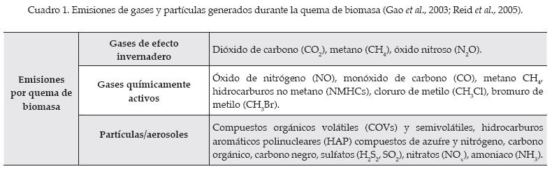 Las emisiones generadas durante la quema de biomasa incluyen un amplio rango de compuestos gaseosos y partículas (cuadro 1), que contribuyen de forma significativa a los balances troposféricos en las escalas local, regional y global. Una característica importante de los aerosoles atmosféricos es la distribución de tamaños, la cual permite conocer el número de aerosoles presentes en un cierto intervalo de tamaños y que además es la base para derivar las propiedades ópticas del aerosol a través de la teoría de dispersión (Toledano-Olmeda, 2005).