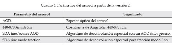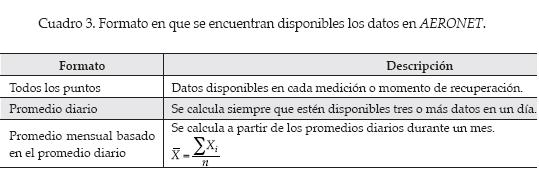 El espesor óptico, por ejemplo, se calcula mediante la extinción espectral de la radiación directa en cada longitud de onda basada en la Ley de Beer-Bouguer-Lambert (ecuación de la transferencia de radiación en la atmósfera). Luego, la atenuación debida a la dispersión de Rayleigh y la absorción por ozono (del atlas climatológico interpolado de ozono) y contaminantes gaseosos se estiman y remueven para aislar el espesor óptico del aerosol. Los datos registrados en cada estación AERONET incluyen el espesor óptico del aerosol y el parámetro de Ångström, entre otros (cuadro 3).