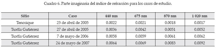 También para el caso 1 se encontraron los valores de ω0 máximos (cercanos a 1 y que indican poca absorción), que relacionan el tamaño de partículas más grandes (figura 5, caso 1) y los valores más pequeños de la parte imaginaria del índice de refracción (cuadro 6).