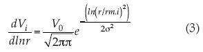 donde rm,i es el modo de radio (medio) relacionado con el modo de acumulación o modo grueso (Remer y Kaufman, 1998); V0 es el volumen de la columna de las partículas por unidad de sección transversal de la columna atmosférica, y σ es la desviación estándar del logaritmo natural del radio. Las unidades de dV/d ln r son [µm3/µm2].