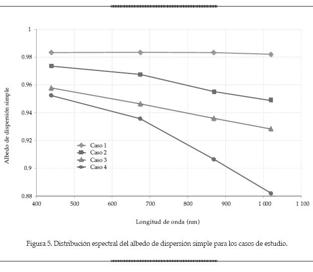 La figura 5 muestra la distribución espectral del albedo de dispersión simple para cada caso de estudio.