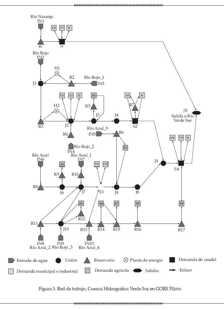 Esta sección presenta la aplicación de la metodología para el caso de uso de una cuenca tutorial denominada Cuenca Hidrográfica Verde Sur (CHVS), caracterizada en sus dominios natural (cantidad, calidad, caudal ecológico), social (economía o capital, valores y gobernanza) y político, en la cual se maneja la mezcla de estas seis variables mediante esta metodología y la red de trabajo por el agua que se muestra en la figura 5. Los caudales históricos naturales de la CHVS se han calculado sobre la base de los caudales diarios registrados y ajustados. El promedio anual de 1912 a 2011 es de unos 9 000 Hm3, con un 17.9, 43.6, 38 y 0.5% en las subcuencas Naranja, Rojo, Azul y Verde Sur, respectivamente. Los usos trabajados fueron en riego, doméstico, industrial, energético, ecológico, y reservas o almacenamiento. Las funciones de beneficio neto para cada uso se estimaron con 50 corridas de la aplicación para cada caso. Se diseñaron seis escenarios (A, B, C, D, E y F) de acuerdo con las demandas, condiciones hidrológicas y aplicativos respectivos.