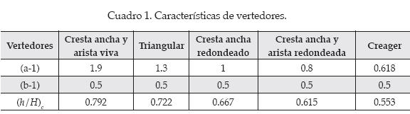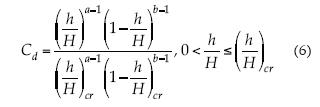 Donde Q*máx es el valor del caudal a descarga libre, y a y b son parámetros de forma, que dependen de las longitudes relativas características y de los números de Froude y Reynolds. Si L es la longitud de la cresta del vertedor, se observa que Q = CdL Qmáx. El cambio de régimen (·)cr viene dado por