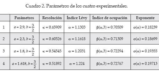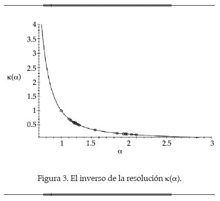 . En la figura 3 se muestra la gráfica de los inversos de la resolución con respecto al índice de estabilidad, donde se aprecian sus ubicaciones relativas y sus posiciones en referencia a los dos extremos marcados por α = 1 y α = 2. En el eje horizontal se representan los valores del índice Lévy α. La línea continua describe la gráfica de