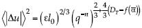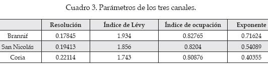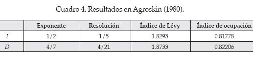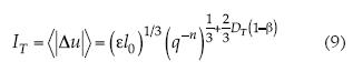 , la dimensión fractal local; DB, el máximo del espectro multifractal y medida del soporte; ε, la tasa de transferencia de la energía cinética; l0, la longitud que corresponde a la dimensión de los vórtices iniciales; y n representando la enésima etapa del proceso de fractalización. Se encuentra que la intensidad de la turbulencia IT, entendida como la media cuadrática del módulo de las variaciones de las velocidades (como sustituto del valor rms, el cual queda indeterminado para las distribuciones Levy, salvo la Gaussiana), puede describirse por