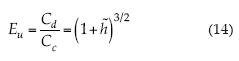 El coeficiente de descarga puede concebirse como un número de Euler que se expresa en función de las longitudes relativas características y de los números de Froude y Reynolds; es un objetivo primordial el esclarecer esa dependencia. Los números de Euler y de Froude se definen, respectivamente, por:
