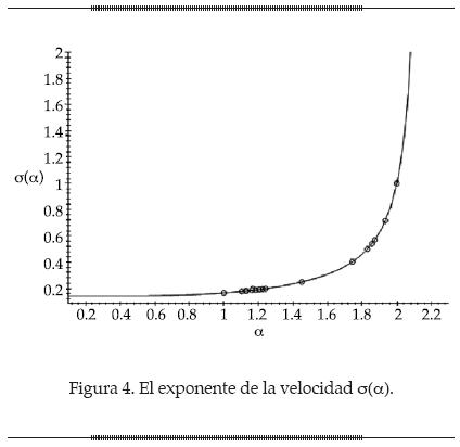 La potencia de la velocidad se ilustra en la gráfica de la figura 4, en donde se señalan los dos extremos representados por α = 1, caso de Cauchy