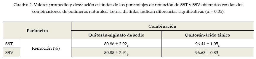 Al comparar las remociones de SST y SSV obtenidas con las dos mezclas, quitosán-alginato de sodio y quitosán-ácido tánico, el análisis no-paramétrico de dos vías de Kruskal-Wallis señala que hay diferencias significativas entre las mezclas y en las dosis (P > 0.05), además de observarse una interacción entre cada combinación de polímeros con la dosis empleada, lo cual demuestra que la eficiencia en la remoción depende de la concentración de la mezcla de polímeros utilizados. De manera posterior, al hacer la comparación múltiple por medio de prueba SNK en un nivel de significancia del 95%, se obtuvo como resultado que la combinación quitosán-ácido tánico es estadísticamente superior a la mezcla quitosán-alginato (P > 0.05) (cuadro 2).