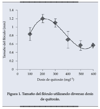 Primero se determinó la dosis óptima de coagulante (quitosán) mediante la medición del tamaño de flóculo, ya que es un determinante en la eficiencia de sedimentación de partículas suspendidas. Si ocurre una sobredosificación tanto el coagulante como las partículas se vuelven a estabilizar, causando una floculación deficiente (Linn et al., 2008).