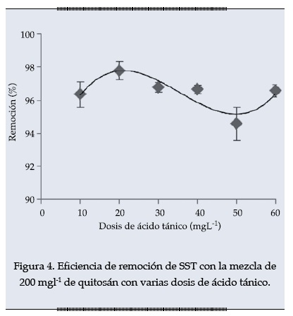 Los resultados obtenidos en la remoción de SST y SSV al ensayar con 200 mgl-1 de quitosán y 10, 20, 30, 40, 50 y 60 mgl-1 de ácido tánico registraron una remoción de hasta el 97.78% de los SST y del 97.79% de los SSV (figuras 4 y 5), observándose además la generación de un sedimento con grumos pequeños que compactaban.