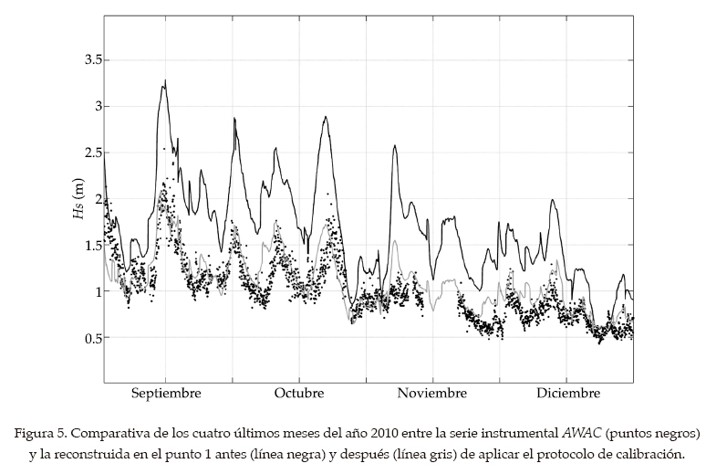 Una vez propagado el oleaje a la zona de estudio y reconstruido en el punto de control 1, se realiza la comparación con la serie GOW propagada de forma híbrida (ver figura 3). Se observa que las predicciones numéricas son reproducidas de forma adecuada, siguiendo las tendencias de máximos y mínimos de Hs a lo largo del tiempo, y observando que la serie numérica presenta una sobre-estimación sistemática de dicho valor, posiblemente debido a la resolución de la malla numérica, que no logra definir de modo adecuado los detalles batimétricos cerca de la costa o bien se puede deber a la ausencia del aporte de oleaje que se genera por viento local, no incluido en las simulaciones, o incluso a una variación en la referencia de cotas de nivel del mar con respecto a las cotas de la batimetría empleadas.