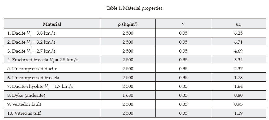 Triaxial tests were carried out on intact rock. The results were used along with the estimated values of the Geological Strength Index (GSI), obtained from field observations, to determinate strength and deformability properties for the geomateriales using the Hoek and Brown failure criterion for jointed rock masses (Hoek & Brown, 1997; Hoek, Carranza-Torres, & Corkum, 2002). The elasticity modulus Em was estimated for two construction rock conditions: zero damage, D = 1 and D = 0.7, which is related to a moderate damage, induced by an adequate and controlled excavation process (Brady & Brown, 2004). The compression wave velocity for the constitutive materials, Vp, was measured from geophysical explorations (see table 1). The Hoek and Brown failure criterion was used for all materials and it was related with Coulomb's failure criterion to estimating an equivalent friction angle, ф, and a cohesive strength, c', according to equations (1) to (3):