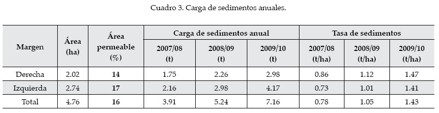 Las cargas anuales de sedimentos transportadas por la escorrentía superficial de la cuenca de margen derecho oscilaron entre 1.75 y 2.26 t, en tanto que para la cuenca de margen izquierdo, los resultados mostraron valores que van de 2.16 a 4.17 toneladas. Las tasas de sedimentos anuales de ambas cuencas, que relacionan la carga de sedimentos con el área de aporte, son similares para los tres años de análisis, presentando valores que van de 0.8 a 1.40 t/ha.