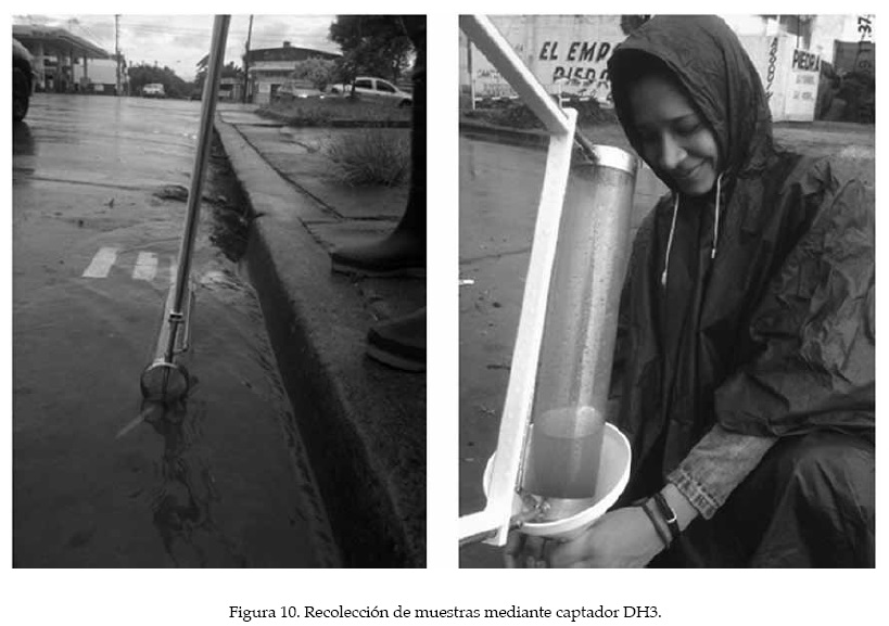 La recolección de muestras se realizó de forma manual mediante el captador DH3, que fue desarrollado en específico para el monitoreo de las aguas pluviales urbanas por el Grupo de Investigación del Departamento de Hidráulica de la Facultad de Ingeniería de la Universidad Nacional del Nordeste. Se colocó el muestrador con las válvulas abiertas, a fin de que ni éste ni su operador interfiriesen el flujo. Llegado el momento, se cerraron instantáneamente las válvulas y se volcó el contenidoen recipientes plásticos (figura 10).