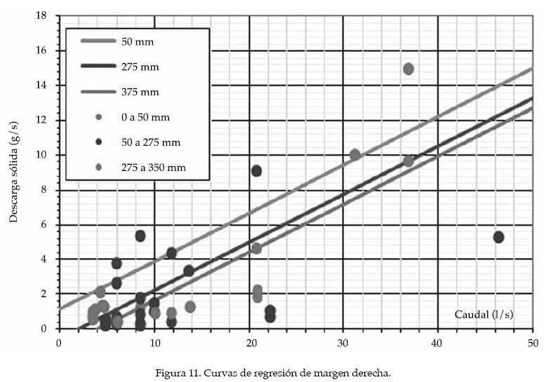 La descarga sólida se obtuvo relacionando el caudal líquido y la concentración de sólidos suspendidos (Mendez et al., 2010). Se trazaron las curvas de regresión para las cuencas de margen izquierdo y derecho (ecuaciones (2) y (3), respectivamente):