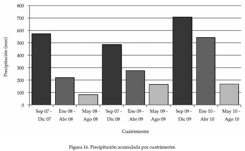 De la observación de la figuras 13, 14 y 15 es posible constatar que las mayores cargas de sedimento se registran en el periodo de septiembre a diciembre de cada año. En efecto, en estos meses se inicia el periodo húmedo, por lo que se presentan dos condicionantes que propician la generación y el trasporte de sedimentos: el escurrimiento de caudales líquidos altos y precipitaciones antecedentes escasas. En la figura 16 se indica la precipitación acumulada por cuatrimestre en el periodo de análisis.
