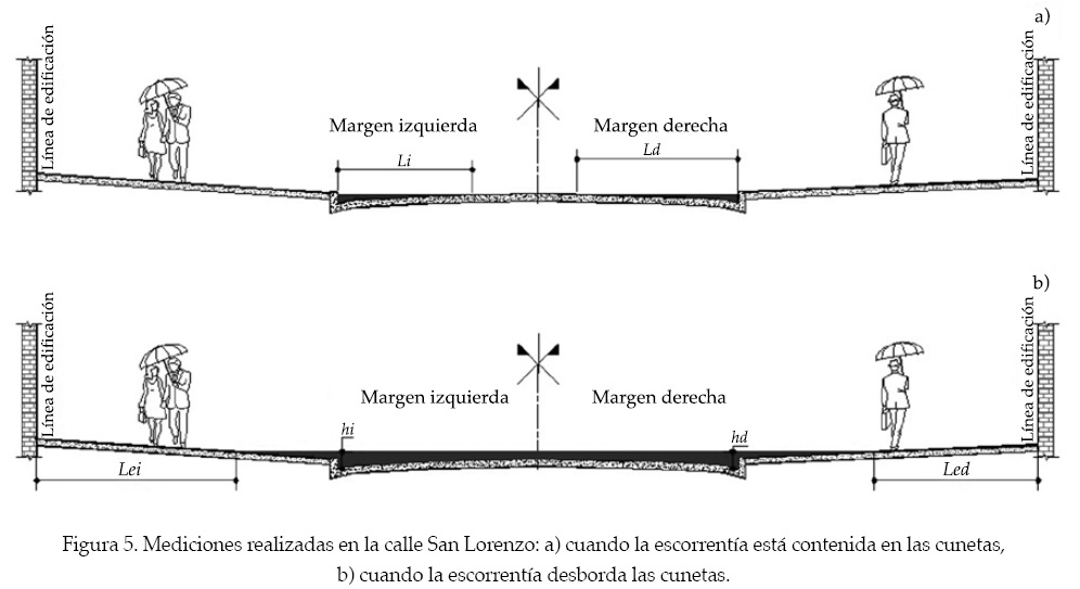 Tanto el aforo de caudales como la recolección de muestras, descrita más adelante, se realizaron en las márgenes izquierda y derecha de la calle San Lorenzo (figura 5). Esta disquisición permitió estudiar el comportamiento de ambas áreas de aporte en forma separada y realizar un análisis comparativo.