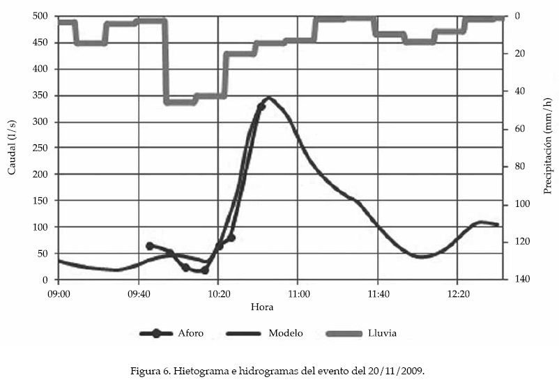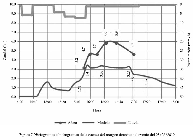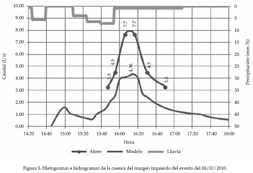 Para caudales bajos, el modelo arrojó valores menores que los aforados, tal es el caso de la precipitación del 08/02/2010 (figuras 7 y 8). Es importante indicar que la metodología utilizada para la medición de los caudales líquidos es imprecisa para caudales menores a 10 l/s, en especial por la variabilidad que presenta el ancho de escurrimiento en una sección con muy bajos tirantes y flujo marcadamente subcrítico.