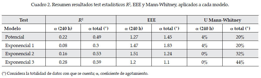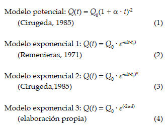 Por otra parte, los modelos matemáticos empleados correspondieron a cuatro tipos: uno potencial y tres exponenciales, en los cuales los parámetros utilizados son el caudal inicial (Q0), el coeficiente de agotamiento (α), un parámetro particular (n) del modelo exponencial 2, la constante de Neper (e) y los tiempos t y t0, donde t0 corresponde al tiempo inicial de los modelos.