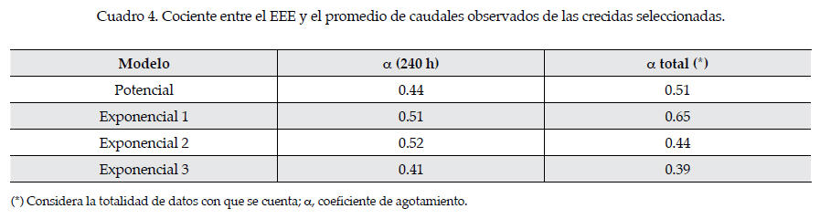 En el cuadro 1 se muestran los coeficientes de agotamiento (α) promedio para los cuatro modelos propuestos para los cinco lapsos establecidos y para las 25 crecidas.