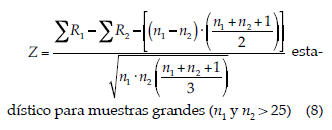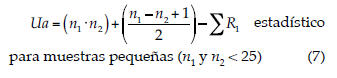 n1: tamaño de la muestra R1; n2: tamaño de la muestra R2; Σ R1: suma de los rangos para la muestra R1; Σ R2: suma de los rangos para la muestra R2.