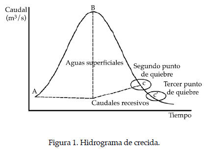 Por otra parte, Linsley, Kohler y Paulhus (1949), y Pizarro (1993) señalan que si se conoce la forma de la curva de recesión del hidrograma es factible calcular el flujo de corrientes durante lapsos de sequía o estiaje. Así, el hidrograma muestra el comportamiento de los caudales con respecto al tiempo, el cual está compuesto por una curva de concentración, una curva de descenso y una curva recesiva (Maidment, 1992; Pizarro, 1993; Aparicio, 2003; Bedient & Huber, 2002; Brodie, Hostetler, & Slatter, 2007). La curva recesiva es aquella donde el flujo proviene exclusivamente de aguas subterráneas y permite calcular la disponibilidad de agua en los periodos entre crecidas, lo cual es de particular importancia en los lapsos estivales. En la figura 1 se puede observar que la curva recesiva o de agotamiento comprende desde el punto C en adelante (Linsley et al., 1949); para el caso del segundo punto de quiebre y el punto C', indica el inicio de los caudales recesivos, según la metodología del tercer punto de quiebre (Pizarro et al., 2013), esta última utilizada en el presente estudio. Lo anterior se debe a que al asumir el tercer punto de quiebre como inicio de la curva recesiva se adquiere una mejor estabilidad de los datos de caudal, reduciendo la variabilidad de los mismos, lo cual permite mejores niveles de ajuste.