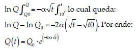 Se sabe además que cuando Q = Q0, se define que t = 0 = t0. Integrando entre los límites t y t0 se tiene: