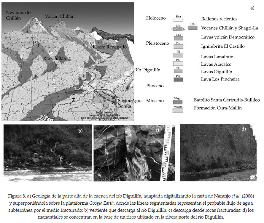 En primer lugar, se realizaron entrevistas a actores locales, como regantes, lugareños, andinistas y pescadores deportivos, a fin de determinar la ubicación de manantiales en el río Diguillín. Por otro lado, se analizó la información geológica disponible (Dixon et al.., 1999; Naranjo, Gilbert, & Sparks, 2008), que explica la marcada influencia de los procesos volcánicos asociados con el Complejo Termas de Chillán sobre la configuración geomorfológica de la cuenca.