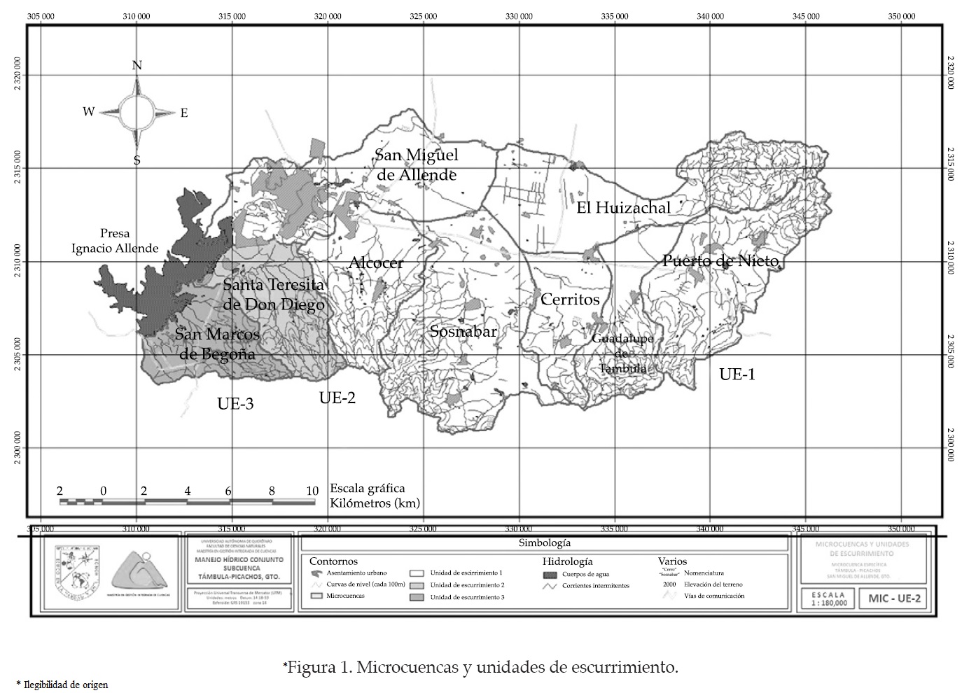 De acuerdo con la división hidrológica superficial de la Comisión Nacional del Agua (Conagua, 2007), la subcuenca Támbula-Picachos (figura 1) pertenece a la cuenca Lerma-Chapala y dentro de ésta, a la cuenca del río Laja, en el estado de Guanajuato. Está conformada por nueve microcuencas (Alcocer, Cerritos, El Huizachal, Guadalupe de Támbula, Puerto de Nieto, Sosnabar, San Marcos de Begoña, San Miguel de Allende, Santa Teresita de Don Diego), con 390.22 km2 de superficie, delimitadas y reconocidas por el Instituto de Ecología del Estado de Guanajuato (IEEG, 2007). La unidad de escurrimiento que es relevante para su manejo es la UE-1, conformada por siete de las nueve microcuencas que desembocan en la ciudad de San Miguel de Allende y la presa Ignacio Allende.
