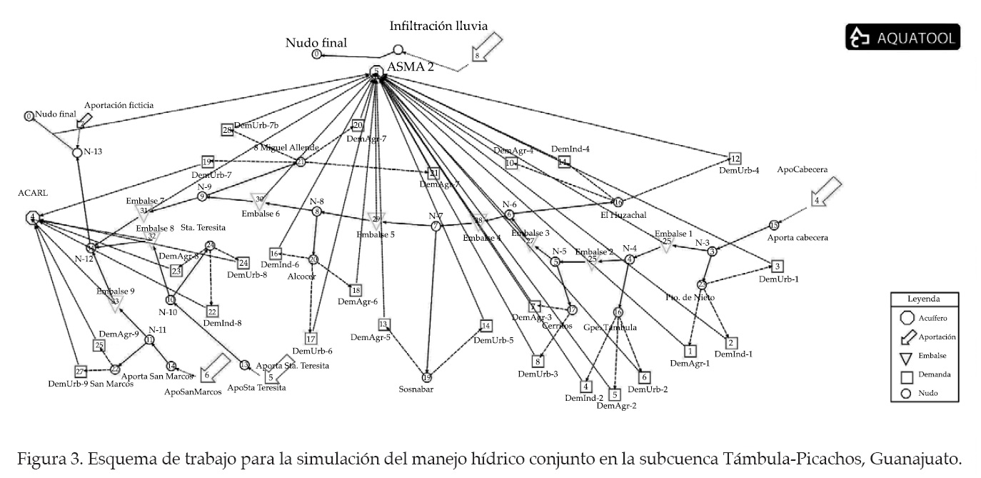 Por sus características geográficas, climáticas y de desarrollo, en regiones como el centro y norte de México existe un grave problema de disponibilidad de agua, siendo la explotación de los acuíferos la principal fuente de abastecimiento. La integración de los sistemas de apoyo en la toma de decisiones tiene como función principal servir de ayuda para el gestor dentro del proceso de toma de decisiones, facilitando la transmisión de información y generación de nuevas ideas. El sistema de apoyo del software Aquatool es una herramienta que permite plantear, generar y discutir distintos escenarios actuales y futuros sobre el manejo de la disponibilidad del agua dentro de una zona de estudio. Con el conocimiento del funcionamiento hidrológico superficial y subterráneo de la subcuenca Támbula-Picachos, Guanajuato, y sus acuíferos relacionados, mediante la adecuación y el uso de modelos matemáticos capaces de reproducir de manera conjunta el flujo del agua en una cuenca, es posible tener una visión general sobre el uso de los recursos hídricos de un territorio, así como su funcionamiento, explotación y renovabilidad.