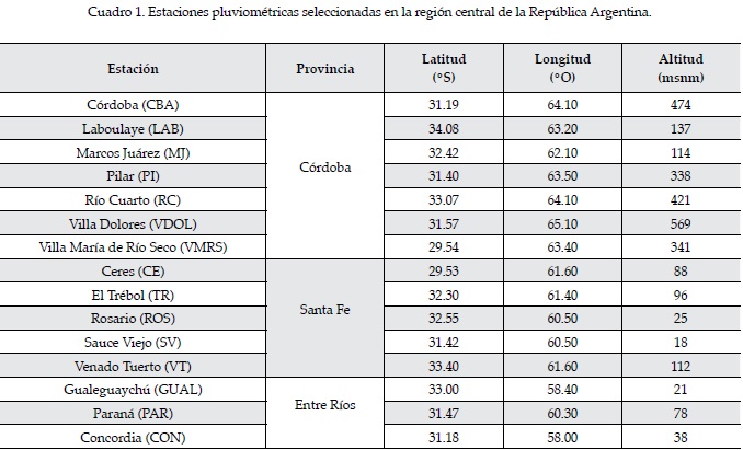 Se utilizaron datos de lluvias mensuales registradas en el periodo 1980-2009, pertenecientes a estaciones hidrometeorológicas de superficie de la región pampeana central de la Argentina. Los datos fueron registrados por el Servicio Meteorológico Nacional (SMN) de la República Argentina, y están disponibles en el Sistema Integrado de Información Agropecuaria (SIIA, sitio web: http://www.siia.gov.ar/). Se incluyeron aquellas estaciones con datos para el periodo de estudio y con un porcentaje máximo de datos faltantes de 5%. Los datos faltantes para cada mes se completaron con los valores promedios históricos de ese mes para la estación analizada, a fin de minimizar los efectos de esta discontinuidad sobre la media de la serie y sobre el posterior cálculo del índice de sequía. Así, se seleccionaron 15 estaciones pluviométricas (cuyas localizaciones se detallan en el cuadro 1), de las cuales siete se encuentran ubicadas en la provincia de Córdoba, Argentina (en las localidades de Córdoba, Laboulaye, Marcos Juárez, Pilar, Río Cuarto, Villa Dolores y Villa María de Río Seco); cinco en la provincia de Santa Fe (en las localidades de Ceres, El Trébol, Rosario, Sauce Viejo y Venado Tuerto), y tres en la provincia de Entre Ríos (en las localidades de Gualeguaychú, Paraná y Concordia). Dado que el periodo de estudio incluye 30 años, se trabajó en cada estación con una serie de 360 valores de lluvia, correspondientes a los 12 meses de los 30 años incluidos en el periodo de estudio.