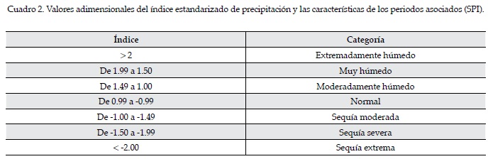 Una vez identificadas las subáreas pluvio-métricamente homogéneas, para evaluar el comportamiento de las sequías observando la variabilidad interanual del proceso, se calculó el índice de precipitación estandarizado (SPI) (McKee, Doesken, & Kliest, 1993) de cada serie temporal y luego se promedió en el nivel de subárea. Se utilizó este índice, ya que el SPI es el índice actual que sintetiza de forma más apropiada las características de la sequía como fenómeno natural, partiendo del principio de que la precipitación pluvial (lluvia), como parte del ciclo hidrológico, define si existe abundancia o déficit de agua en relación con las condiciones medias de la escala o periodo que se considere (Velasco & Aparicio, 2004). Este índice considera las probabilidades de ocurrencia de precipitación pluvial para un periodo dado y su cálculo consiste en ajustar una serie histórica de precipitación mensual con la función de distribución probabilística gamma, ya que es la función de distribución que mejor ajusta a la variable precipitación (Thom, 1966; Young, 1992). El índice SPI permite realizar la medición de la sequía en distintas escalas temporales, dependiendo del objetivo de estudio. En este caso, con el fin de observar y caracterizar el comportamiento plurianual de las sequías meteorológicas, a nivel mensual, a través de varias estaciones en una amplia región y en un periodo prolongado de tiempo (30 años), se considera pertinente utilizar la escala temporal de 12 meses para su estimación. Se considera sequía (situación de déficit) cuando el valor del índice es igual o menor a -1. McKee et al. (1993) definen los valores del SPI y las características de los periodos asociados con esos valores, los cuales se presentan en el cuadro 2.
