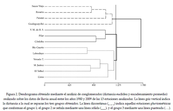 Para agrupar las estaciones, se implementó un criterio de clasificación en el cual se complementa un análisis que tiene en cuenta las características físicas del lugar donde se localizan las estaciones pluviométricas y análisis estadísticos multivariados sobre la variable lluvia media anual en cada localización. En primera instancia se descartaron como representativas de la región de estudio las estaciones de Villa Dolores (provincia de Córdoba) y Concordia (Entre Ríos), ya que no tienen correspondencia con el resto de las estaciones de la región. Se conformaron finalmente tres subáreas homogéneas estadísticamente (grupos). Considerando su comportamiento pluviométrico y las estaciones representativas de cada una son las siguientes: grupo 1: estaciones de Sauce Viejo, Rosario, Paraná y Gualeguaychú; grupo 2: estaciones de Villa María de Río Seco, Pilar y Córdoba; grupo 3: estaciones de Río Cuarto, Laboulaye, Venado Tuerto, Marco Juárez, el Trébol y Ceres.