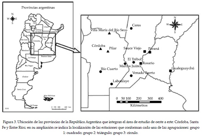 Dado el número de estaciones y según las características físicas y pluviométricas de las mismas, se definió que la cantidad óptima de zonas o subáreas homogéneas es tres. El análisis de conglomerados identificó los siguientes tres grupos: el grupo 1 está conformado por las estaciones de Sauce Viejo, Rosario, Paraná y Gualeguaychú; el grupo 2 por las estaciones de Villa María de Río Seco, Pilar y Córdoba, y por último, el grupo 3, conformado por las estaciones de Río Cuarto, Laboulaye, Venado Tuerto, Marco Juárez, el Trébol y Ceres. En la figura 2 se muestra el dendrograma obtenido mediante el análisis de conglomerados, y en la figura 3 se ubica la región de estudio dentro de un mapa de la República Argentina y se identifican las estaciones que conforman cada una de las agrupaciones o subáreas.