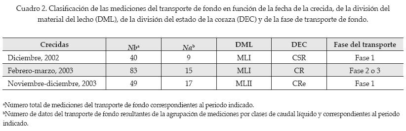 El análisis detallado de las características y dinámica del acorazamiento del río Ebro en el tramo de estudio se describió en Vericat et al. (2006a). El lecho del río, en el tramo de estudio, experimenta un proceso cíclico de incisión y acorazamiento relacionado con la magnitud del flujo. El análisis granulométrico de las muestras de carga de fondo, junto con observaciones de campo durante el periodo de estudio revelaron que: a) con posterioridad a la primera crecida de diciembre de 2002 la coraza persistía; b) las crecidas acontecidas en febrero y marzo de 2003 alteraron o rompieron la coraza; y c) la coraza puede considerarse ya restablecida durante las avenidas de noviembre y diciembre de 2003 (véase el cuadro 2). Con arreglo a dichas consideraciones se dividieron cronológicamente los datos, en función de las condiciones o estado de la coraza (DEC), constituyéndose tres conjuntos (cuadro 2): 1) coraza sin romper (CSR); 2) coraza rota o alterada (CR), y 3) coraza restablecida (CRe). Asimismo, y en consecuencia, se adoptó una hipótesis de asociación entre cada uno de los tres conjuntos y la fase de transporte de fondo. Es decir, se consideró que en los conjuntos CSR y CRe, la fase de carga de fondo representativa era la 1, y que las fases 2 o 3 caracterizaban el transporte de fondo en el conjunto CR (cuadro 2). Además, nótese la relación resultante entre los conjuntos integrantes de las divisiones DEC y DML (cuadro 2).