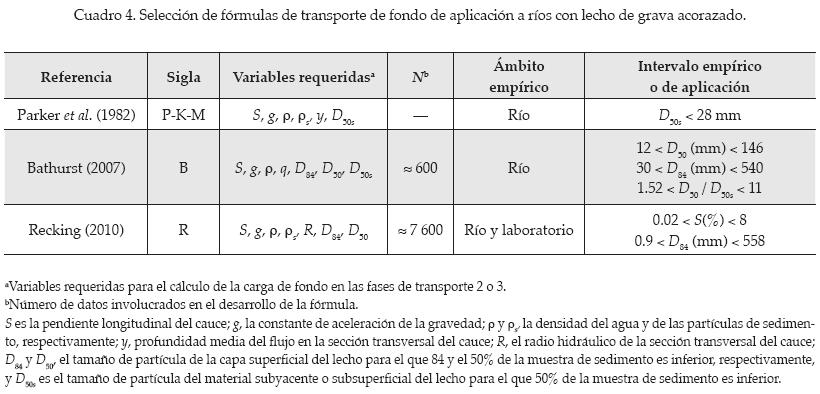 Dadas las restricciones expuestas, las fórmulas finalmente seleccionadas para su evaluación fueron las desarrolladas por Parker et al. (1982), Bathurst (2007) y Recking (2010) (referidas en lo sucesivo como P-K-M, B y R, respectivamente). En el cuadro 4 se muestran de forma sintética las variables requeridas y el intervalo experimental o de aplicación de las ecuaciones (nótese que en los tres casos, la base empírica incluye datos de ríos). Puede observarse que tanto el valor de pendiente media del cauce como del tamaño de las partículas de sedimento del tramo de estudio cumplen con los intervalos experimentales de las fórmulas evaluadas. La fórmula R permite determinar en cuál de las tres fases teóricas se produce el transporte de fondo (es decir, fase 1, 2 o 3) y predecir el correspondiente valor de caudal sólido. En cambio, la fórmula B sólo predice la carga de fondo en el caso de rotura o alteración de la coraza (sin distinguir de manera explícita entre las fases 2 y 3). Por último, la fórmula P-K-M predice el transporte de fondo solamente en caso de alteración de la coraza y suponiendo que todos los tamaños de partícula inician de manera simultánea su movimiento cuando acontece la condición crítica de alteración o rotura (concepción que guarda mayor relación con la definición de la fase 3 del transporte).