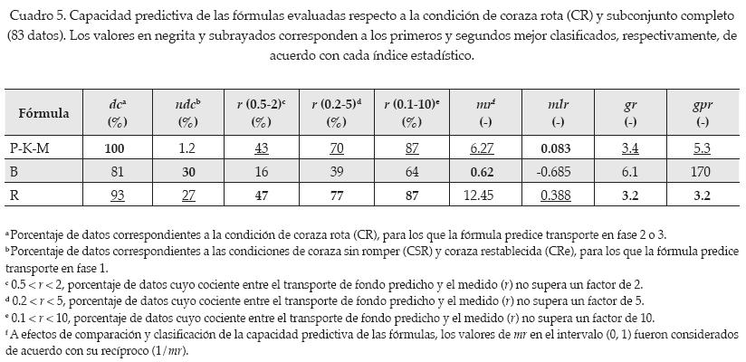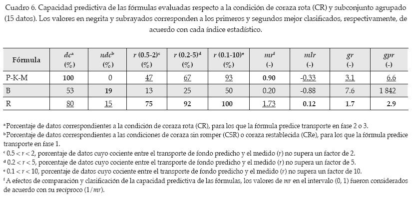 En primer lugar se analizó la capacidad de las fórmulas para la predicción del umbral de rotura o alteración de la coraza. Para ello se atendió al valor de los índices dc y ndc consignados en los cuadros 5 y 6. El índice dc se definió como el porcentaje de datos del subconjunto CR (condición de coraza rota), para los que la fórmula predijo rotura de la coraza o fases de transporte 2 o 3. En los cuadros 5 y 6 puede comprobarse que la fórmula P-K-M es la que mejor rendimiento mostró, con un 100% en ambos subconjuntos (completo y agrupado). La fórmula R también alcanzó porcentajes elevados, entre 80 y 93%, dependiendo del subconjunto. Por último, el resultado de la fórmula B fue más sensible a la agrupación de datos, ya que su porcentaje descendió de 81 a 53%. En un sentido complementario, el índice ndc se definió como el porcentaje de datos de la suma de los subconjuntos CSR y CRe para los que la fórmula no predijo rotura de la coraza o predijo fase de transporte 1. En este caso, el rendimiento de las fórmulas resultó muy inferior al analizado antes. En efecto, las fórmulas B y R, que mostraron resultados similares, no superaron 30% en el mejor de los casos, mientras que la fórmula P-K-M apenas superó 1%. Por consiguiente, en términos generales, en el tramo de estudio, las fórmulas evaluadas predijeron un umbral de rotura o alteración de la coraza que se encontró por debajo del observado. Es decir, predijeron el inicio de la fase de transporte 2 o 3 antes de que ésta se produjera realmente. En función de los resultados expuestos y a efectos prácticos del tramo estudiado, lo más recomendable sería emplear de forma conjunta las fórmulas B y R (evitando, en cualquier caso, el uso de la fórmula P-K-M) para predecir el umbral de rotura o alteración de la coraza, y el inicio de la fase de transporte de fondo 2, aunque teniendo en cuenta que muy probablemente dicho umbral resulte demasiado bajo.
